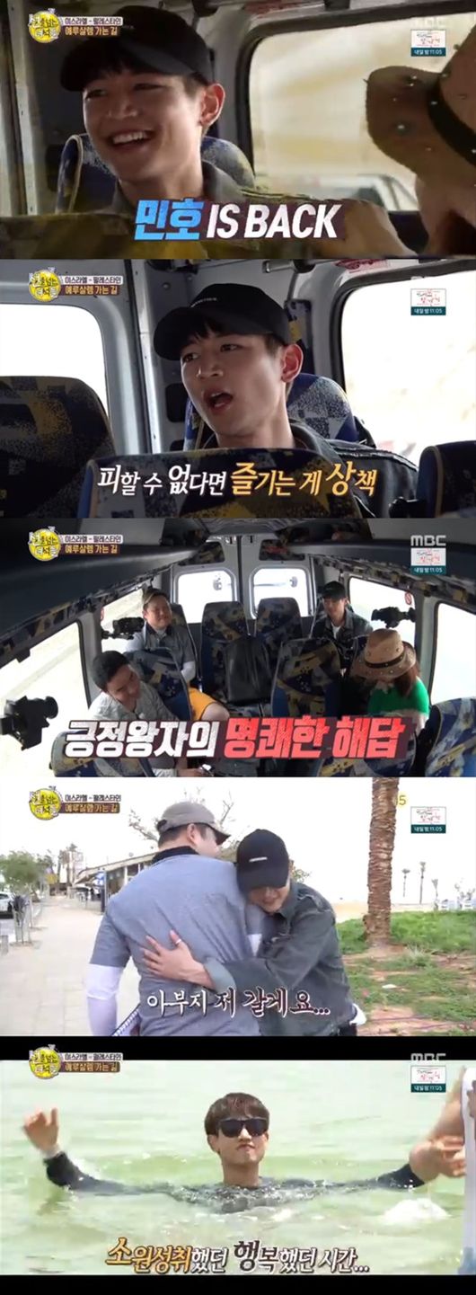 민호는 그토록 염원했던 사해 방문에 설렘을 드러냈다. 그는 여행 시작부터 "사해를 보고 싶다"고 노래를 불러왔던 터. 그는 설민석이 낸 "사해에서 몸이 왜 뜨는 줄 아냐"는 사지선대 문제에 유일하게 '밀도'라고 홀로 정답을 맞히고 춤을 추듯 기뻐하기도 했다.