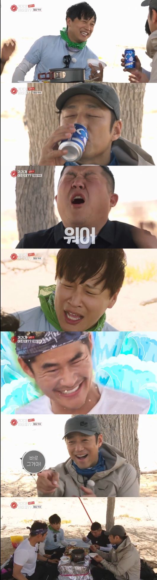 지난 29일 오후 방송된 KBS 2TV '거기가 어딘데??'에선 지진희, 차태현, 배정남, 조세호가 사막 탐험 3일차를 맞는 모습이 그려졌다.