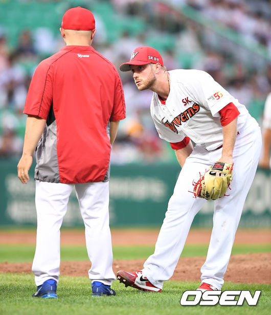 SK 우완 외인 메릴 켈리(30)가 비교적 잘 던졌으나 햄스트링 경련에 발목이 잡혔다. 시즌 7승 도전도 무산됐다.