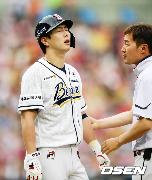 두산 관계자는 "2회말 사구 부위인 왼팔 타박상으로 선수 보호 차원에서 4회초 수비시 조수행으로 교체됐다"고 설명했다./ bellstop@osen.co.kr