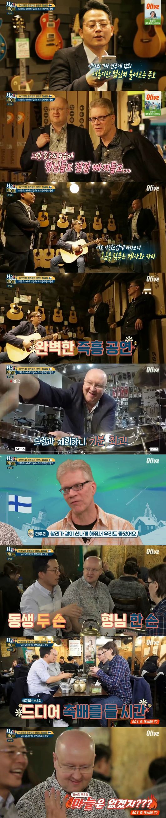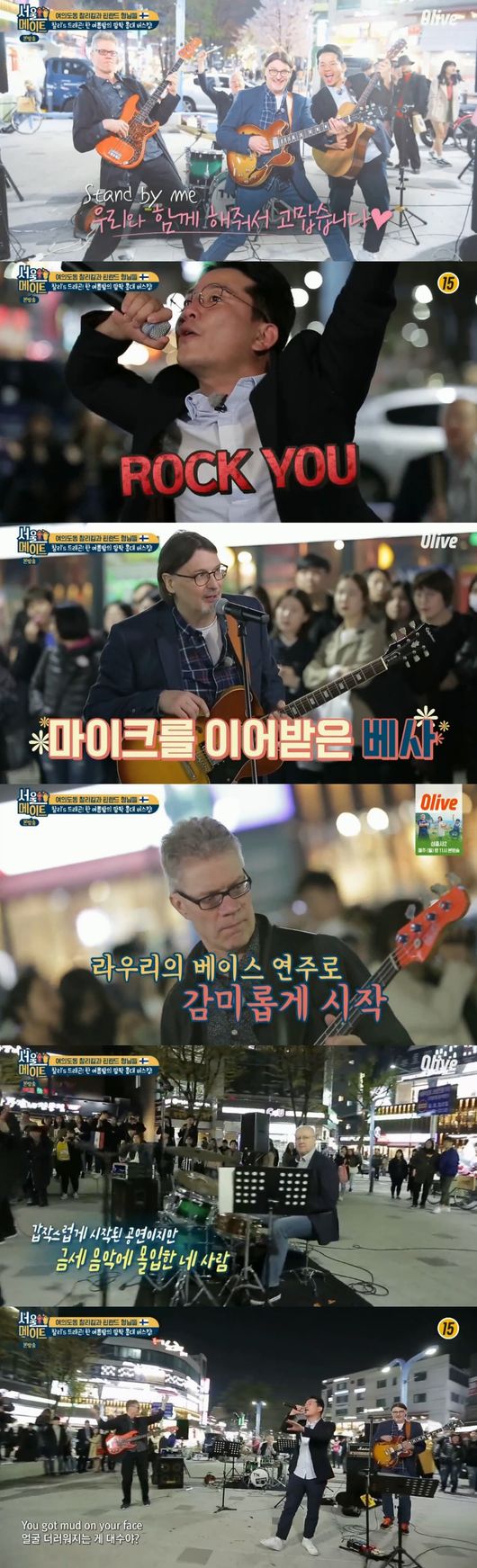 이어 마이크를 잡은 형님들. 리더 베사는 핀란드에서 밴드한 실력을 뽐내며 '헤이 주드'와 '스탠바이미'를 열창했다. 김준호 역시 형님들 사이 자리를 잡고 4인조 밴드를 완성했다. 이를 지켜보는 관객들은 네 남자의 수준급 버스킹에 감동했다.