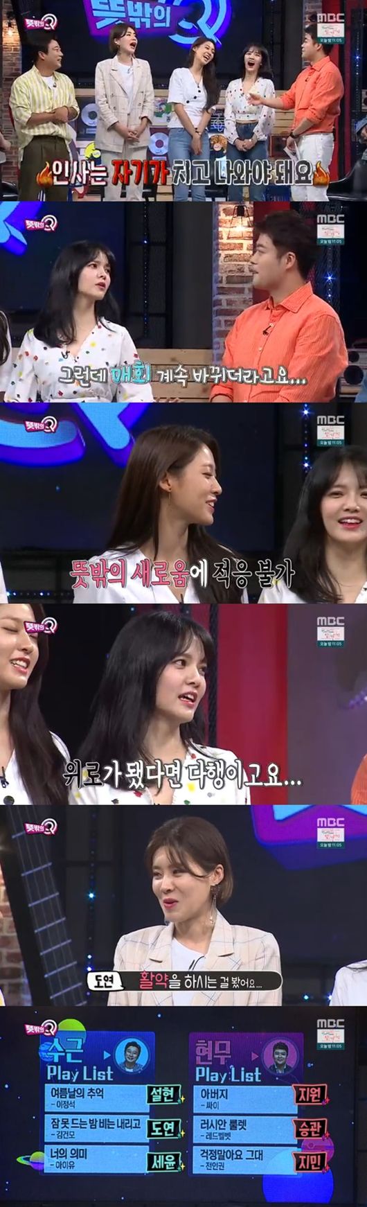 설현과 지민은 "'뜻밖의Q'를 정말 열심히 모니터링했다"며 "우리가 열심히 모니터링을 했는데 매회 바뀌더라. 이제는 자리 잡으셨으면 좋겠다"고 측은한 듯 말해 MC들을 웃프게 만들었다. 설현은 "계속 연습했는데 진짜 모르겠더라. 지난 주에 하나 맞혔다. '터치 마이 바디'를 맞혔다. 우리끼리 막 맞히다가 '언니 맞혔다. 진짜 천재다'하면 틀렸다"고 에피소드를 전해 눈길을 모았다.