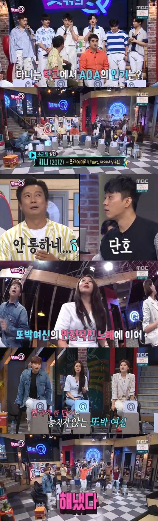 30일 오후 방송된 MBC 예능 프로그램 '뜻밖의Q'에서는 AOA 설현, 지민, 장도연이 출연했다.