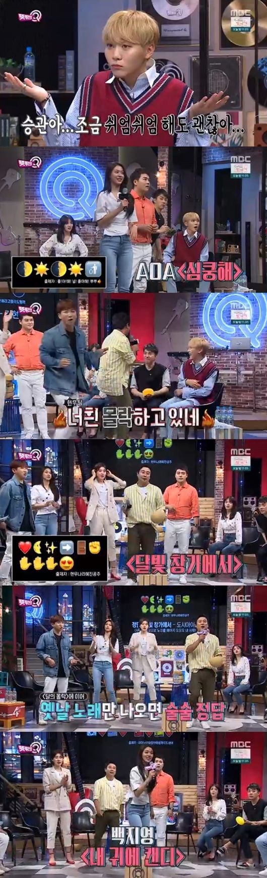발군의 실력을 가진 설현, 또 다른 또박여신 지민의 활약과 '부크박스' 부승관의 긴 솔로 클리어로 이들은 돌림노래를 무사히 끝낼 수 있었다. 이들은 이모티콘 퀴즈에 나섰다. 이모티콘 퀴즈의 에이스 부승관은 형들로부터 "얘 오늘 왜 이렇게 상태 안 좋냐"는 말을 들 정도로 헛발질을 해 웃음을 자아냈다. 대신 평소에 헛발질만 하던 이수근이 정답 행렬을 보였다.