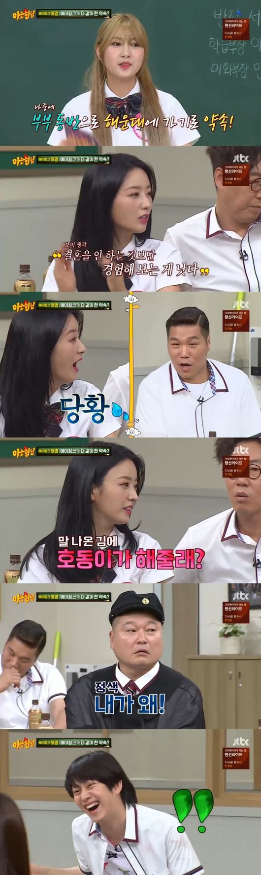 정답은 '부산 해운대를 같이 가자'는 것이었다. 갓 데뷔했을 당시 해운대 공연 후 너무 바쁜 탓에 바다도 못 보고 왔다는 것. 이후 나중에 부부동반으로 해운대 오자고 약속했다고 전했다. 아형은 "모이면 이제 결혼얘기하냐"고 기습 질문, 보미는 "빨리 하고 싶다"라면서 "안하는 것보다, 갔다오는 것이 낫다고 들었다"고 말했고, 얼떨결에 장훈과 상민을 저격해 웃음을 안겼다.