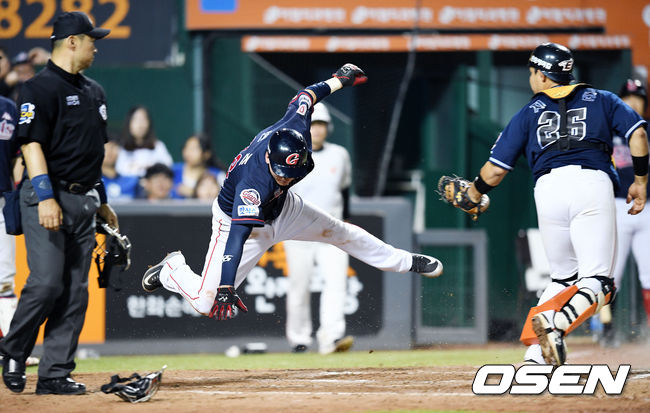 그러자 백창수가 포수 지성준을 향해 홈 송구했고, 번즈는 태그를 피해 점프를 시도했지만 늦었다. 그런데 여기서 혼선이 빚어졌다. 황진수가 백창수와 1루에서 부딪친 뒤 넘어졌고, 1루심 구명환 심판위원이 '타임'을 선언하며 볼 데드가 된 것이다. 그러자 한용덕 감독이 나와 강력하게 어필했다.