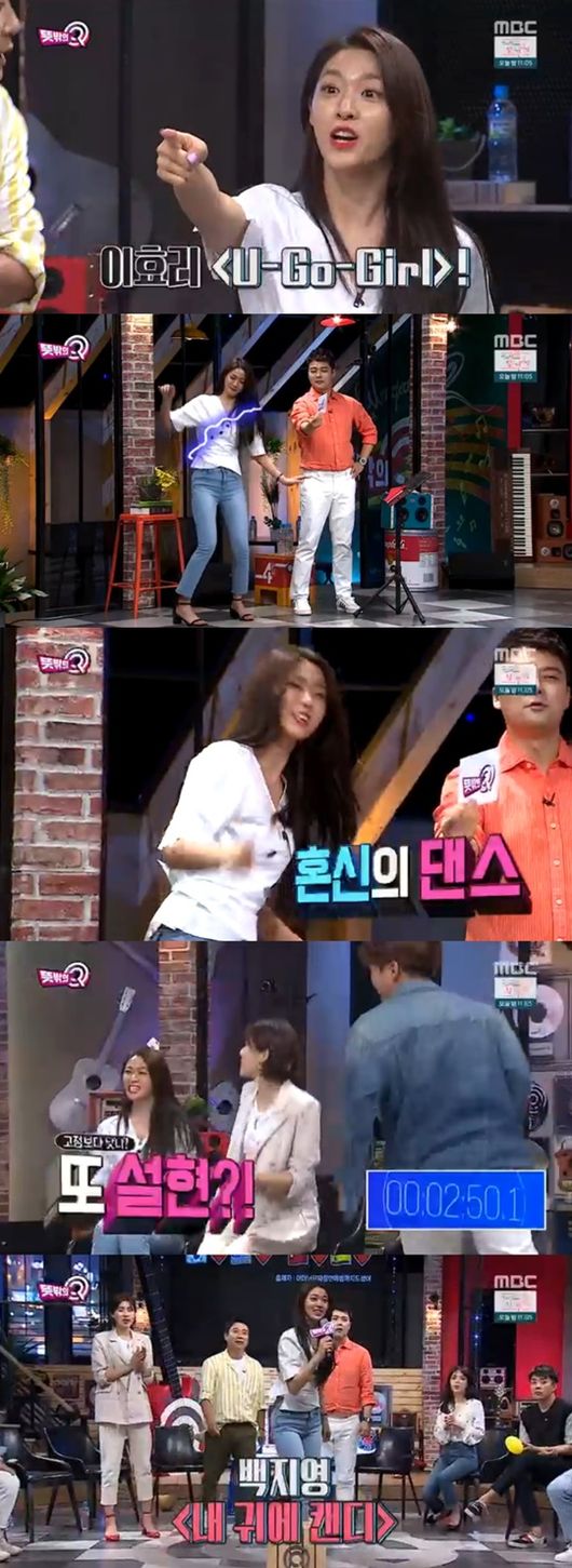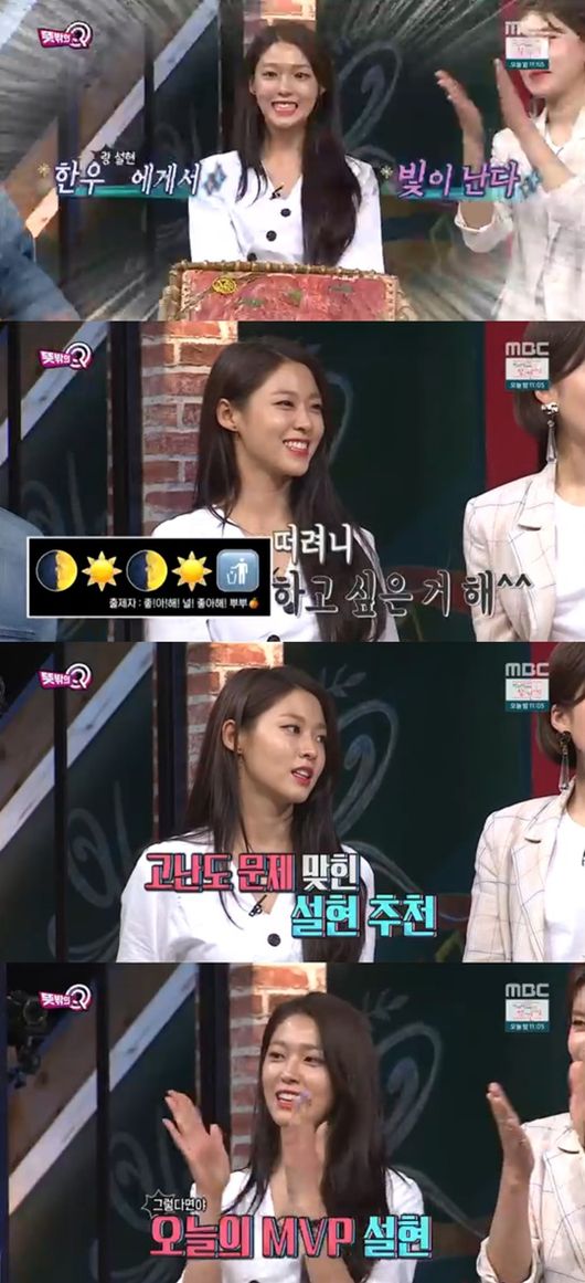 설현은 돌림노래를 맞히는 코너에서도 빛나는 활약을 보였다. 더 이스트라이트의 난이도 높은 편곡 문제에 장도연, 은지원은 실수를 연발했다. 하지만 설현은 침착하게 가사를 맞혀나가 '또박여신'이라는 타이틀을 얻게 됐다.