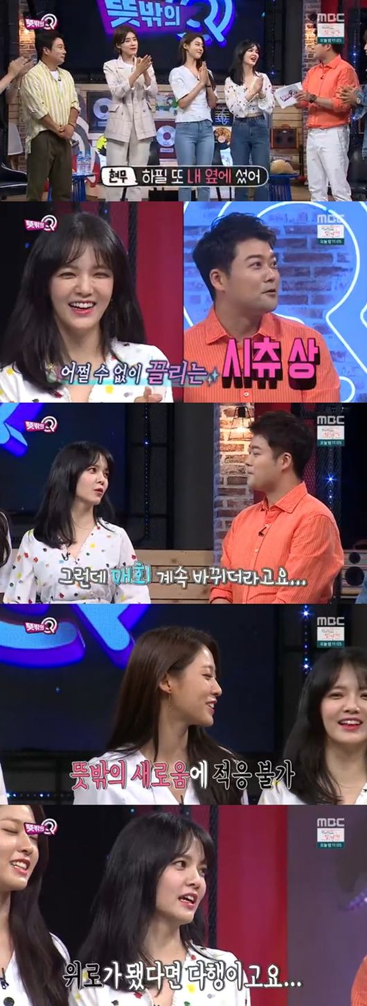 AOA 설현과 지민은 이런 MC들의 셀프 디스를 듣기라도 한 듯 '돌직구 발언'으로 위로 아닌 위로를 했다. 설현과 지민은 "'뜻밖의Q'를 정말 열심히 모니터링했다"며 "우리가 열심히 모니터링을 했는데 매회 바뀌더라. 이제는 자리 잡으셨으면 좋겠다"고 말해 보는 이를 폭소케 했다.