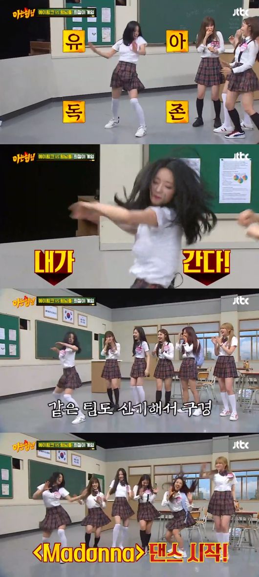 또한 오하영은 전주만 듣고 노래를 맞히는 김희철에게 “우린 노래와 춤까지 맞히기를 하겠다”고 도발했고 에이핑크와 ‘아는 형님’의 단체전이 펼쳐졌다. 오하영이 노래를 맞히고 칼군무를 선보였는데 윤보미가 시크릿의 ‘마돈나’를 추며 또 한 번 파워풀한 매력을 발산해 웃음을 자아냈다.