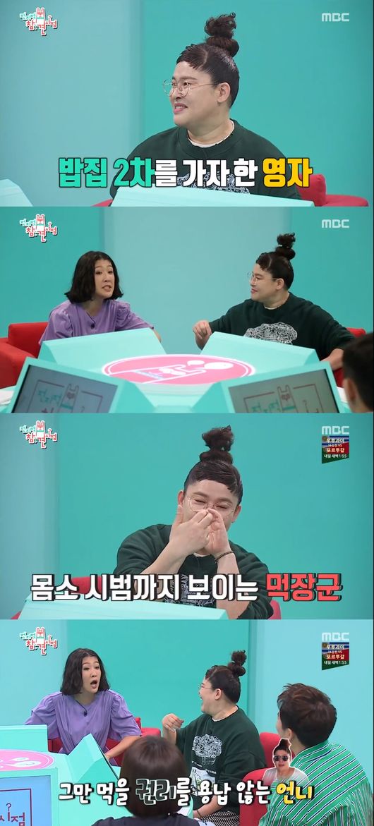 먹장군 이영자에 대한 에피소드는 계속 이어졌다. 평소 이영자는 술을 한 잔도 못마시는 체질이었다. 하지만 홍진경은 이영자가 밥주정을 한다고 폭로했다. 홍진영이 이영자가 밥을 많이 먹으면 모든 것을 다 귀찮아하고 눈이 풀린다고 했다.