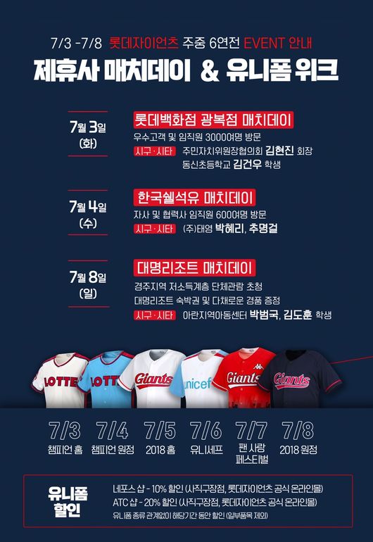롯데자이언츠는 오는 3일부터 열리는 홈 6연전을 맞아 제휴사 매치데이 및 유니폼위크를 진행한다.