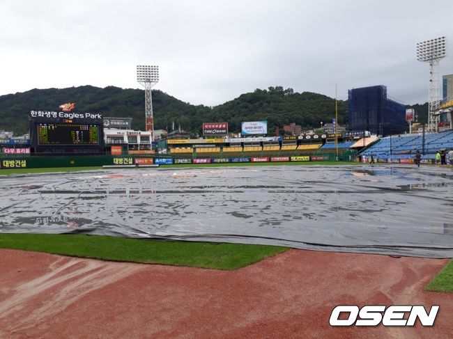 1일 대전한화생명이글스파크. 롯데-한화전을 앞두고 전국적인 장맛비로 대전 지역에도 오전부터 비가 내렸다. 이글스파크도 전날 밤부터 대형 방수포를 깔아 내야 전체를 덮어놓았다. 오후가 되어서도 비가 멈추지 않았고, 적잖은 양의 비가 그라운드를 덮었다.