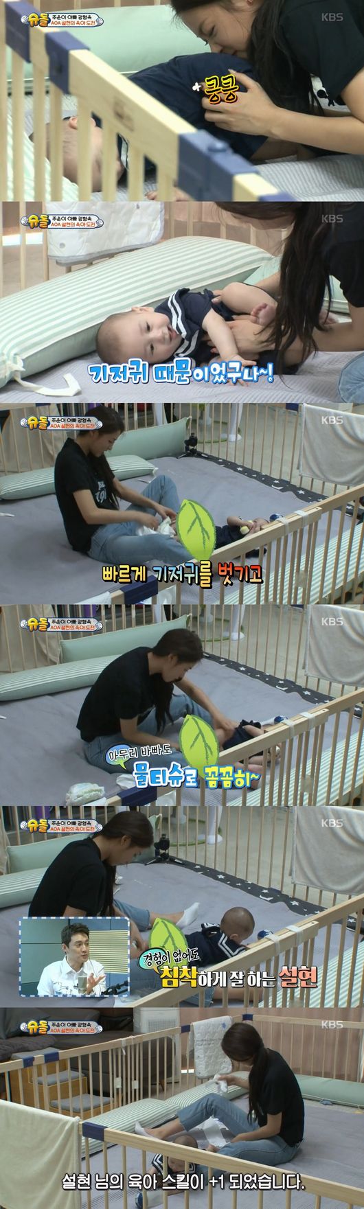 육아가 처음인 설현과 미소천사 주운이의 케미스트리는 기대 이상이었다. 힘이 넘치는 주운의 모습에 육아초보 설현은 당황했지만 기저귀를 갈아주는 것부터 이유식을 챙겨주는 것까지 완벽하게 처리해 감탄을 자아냈다.
