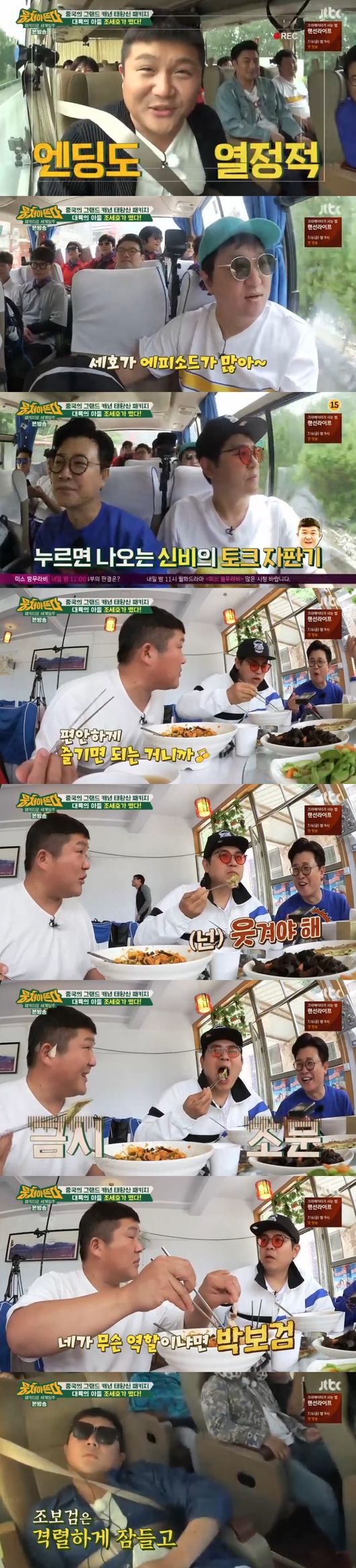 버스 안에서도 웃음이 끊이지 않았다. 조세호는 형들을 웃게하기 위해 특파원으로 바로 변신, 투머치한 혼잣말에 이어 인터뷰 요청까지 바쁘게 움직였다. 하지만 이내 지쳤는지, 갑자기 급 마무리 시도해 웃음을 안겼다. 그럼에도 열정적으로 엔딩을 마무리했고, 가이드인 메인 MC까지 깔끔하게 소환했다.