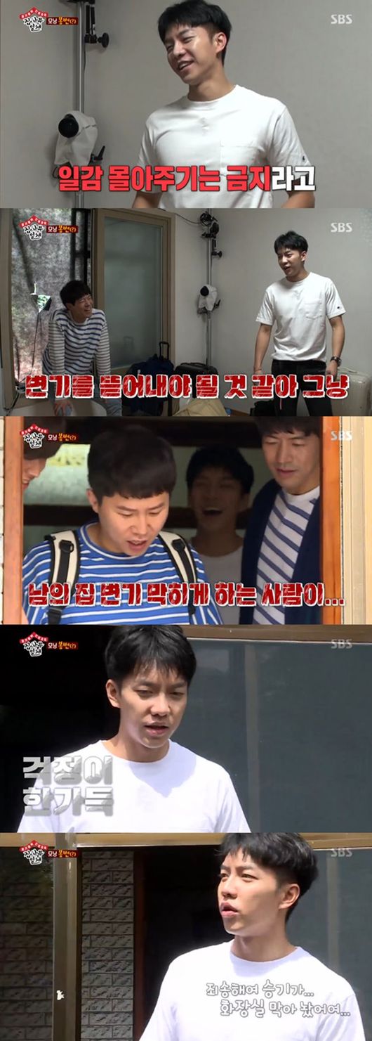 이유는 이승기가 이용한 이후 화장실 변기가 막혔기 때문. 약한 수압 때문에 이승기는 당황했고, 이에 양세형과 이상윤은 이승기 놀리기에 나선 모습이었다. 고두심은 이승기를 배려했지만 이승기는 멤버들의 놀림에 당황했다. 의도하지 않은 상황에서도 웃음을 이끌어내는 이승기였다.