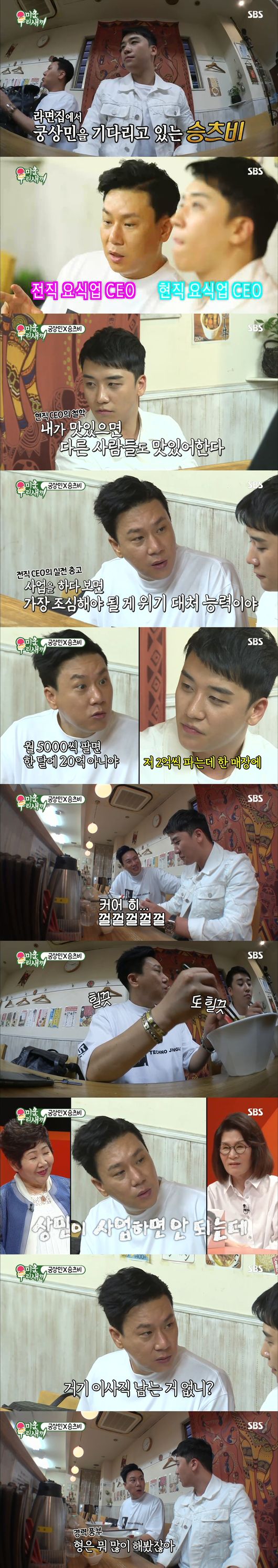 이날 ‘최고의 1분’을 차지한 것은 승리와 이상민의 만남. 전현직 요식업 CEO인 두 사람은 시장조사 차원에서 일본 라멘집을 방문했다. 승리는 확고한 사업 철학을 바탕으로 끊임없이 질문하고 공부해 이상민을 감동시켰다.