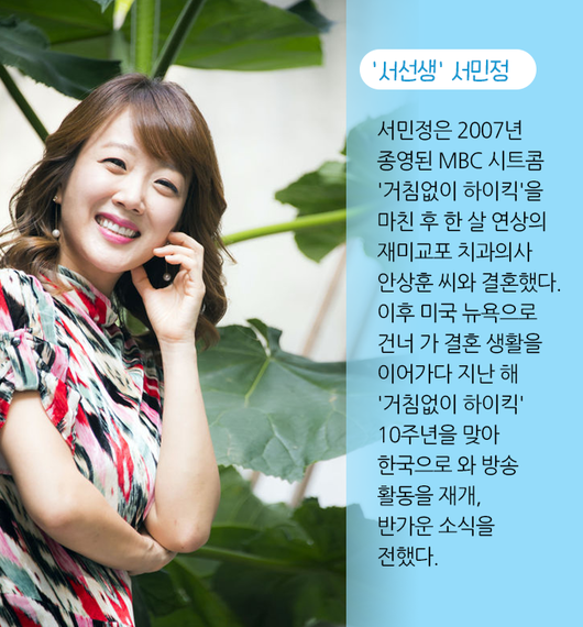 서민정은 2007년 종영된 MBC 시트콤 '거침없이 하이킥'을 마친 후 한 살 연상의 재미교포 치과의사 안상훈 씨와 결혼했다. 이후 미국 뉴욕으로 건너 가 결혼 생활을 이어가다 지난 해 '거침없이 하이킥' 10주년을 맞아 한국으로 와 방송 활동을 재개, 반가운 소식을 전했다.