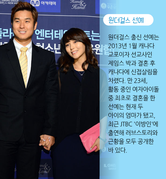 원더걸스 출신 선예는 2013년 1월 캐나다 교포이자 선교사인 제임스 박과 결혼 후 캐나다에 신접살림을 차렸다. 만 23세, 활동 중인 여자아이돌 중 최초로 결혼을 한 선예는 현재 두 아이의 엄마가 됐고, 최근 JTBC '이방인'에 출연해 러브스토리와 근황을 모두 공개한 바 있다.