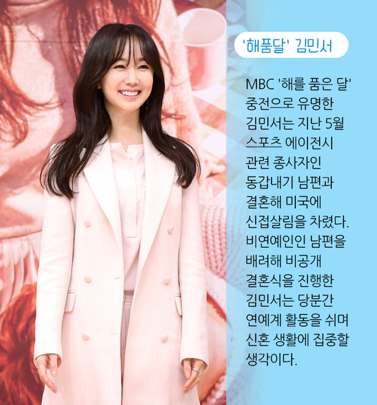 MBC '해를 품은 달' 중전으로 유명한 김민서는 지난 5월 스포츠 에이전시 관련 종사자인 동갑내기 남편과 결혼해 미국에 신접살림을 차렸다. 비연예인인 남편을 배려해 비공개 결혼식을 진행한 김민서는 당분간 연예계 활동을 쉬며 신혼 생활에 집중할 생각이다.