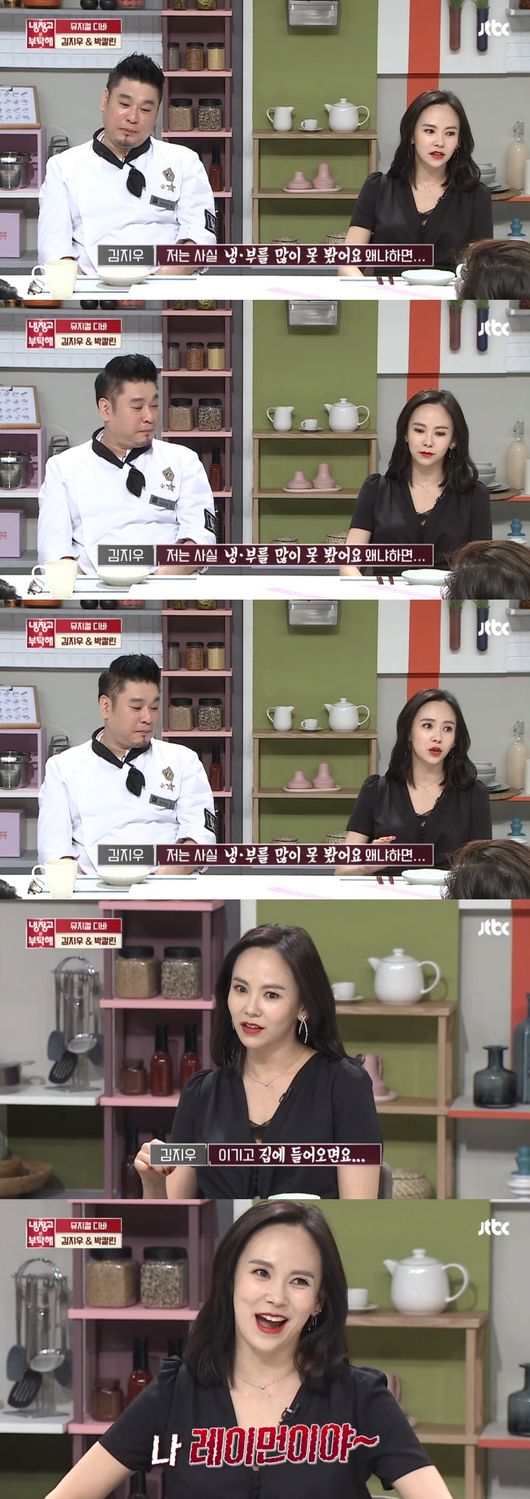 김지우의 냉장고에는 각종 고기부터 치즈, 소스들이 가득했다. “우리나라에서 스테이크를 제일 잘한다. 공연할 때 힘들면 남편이 염소탕을 끓여준다”고 깨알 같이 자랑을 했다.