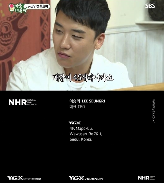 MBC ‘나 혼자 산다’에 출연할 때에는 승리의 사업가적 모습이 부각돼 반전 매력을 선사하기도 했다. 그는 4개 국어를 구사하는 것은 물론, 24시간이 모자랄 만큼 열정을 불태우는 모습이 눈길을 끌었다. 이에 ‘위대한 승츠비’라는 별명을 얻으며 각종 프로그램 시청률을 상승시키는 등 ‘예능 치트키’로 등극했다. 이밖에 JTBC ‘아는 형님’, MBC ‘라디오스타’ 등 인기 높고 다소 게스트에게 힘든 예능 프로그램에도 특유의 재치 있는 입담으로 휘어잡은 바 있다.