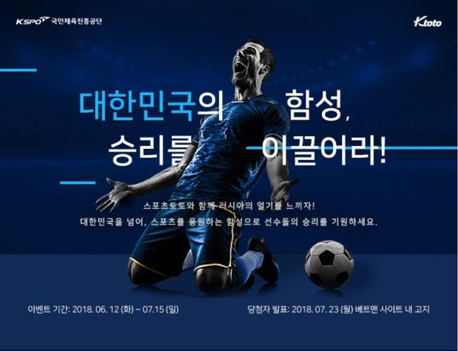 체육진흥투표권 스포츠토토의 수탁사업자인 ㈜케이토토가 공식 온라인 발매 사이트 배트맨(www.betman.co.kr)을 통해 오는 7월15일(일)까지 진행하는 ‘대한민국의 함성, 승리를 이끌어라’ 이벤트 종료가 임박했다.
