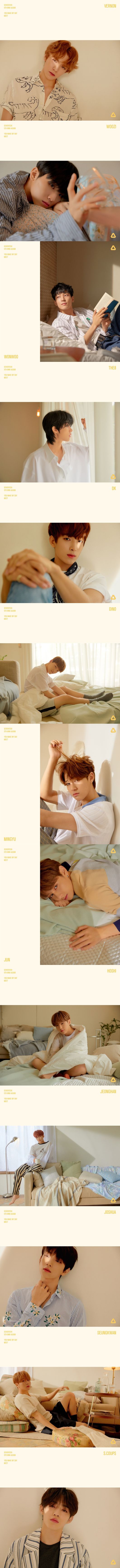 마지막으로 디노, 민규, 준, 호시는 카리스마 넘치는 모습부터 귀여운 모습까지 담아내는 등 자연스러운 분위기 속 다채로운 매력을 발산했으며 정한, 조슈아, 승관, 에스쿱스는 한적하고 나른한 느낌을 가진 각각의 장소에서 정면을 응시하며 따뜻하고 서정적인 분위기를 자아냈다.