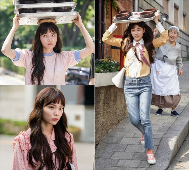 공개된 사진 속 윤소희는 보기만 해도 아슬아슬한 3단 국밥 쟁반을 머리에 이고 있어 시선을 강탈한다. 온 동네를 무법자처럼 휘저으며 국밥을 배달하기 위해 동분서주하고 있는 모습. 특히 내리막길을 거침없이 내달리는 여유로움까지 탑재해 보는 이들을 깜짝 놀라게 한다.