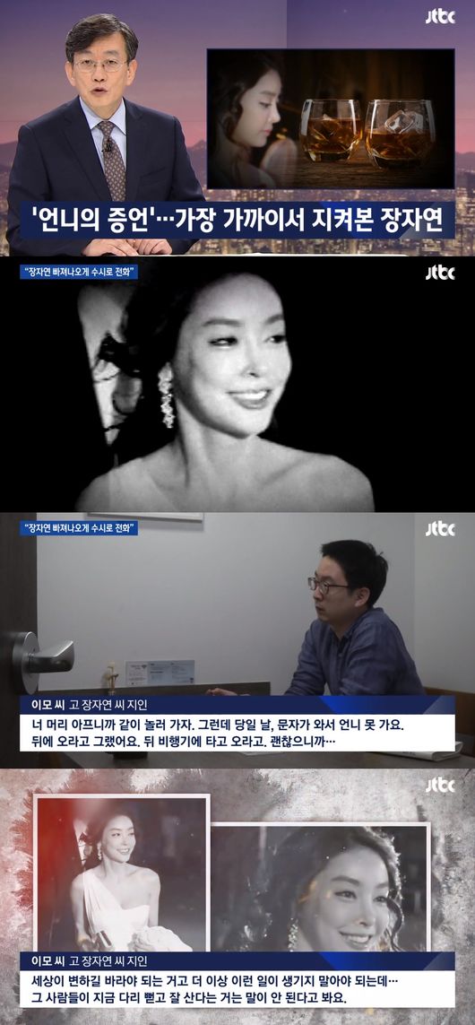 이모 씨는 장자연과 친언니처럼 지내던 아주 가까운 지인. 이 씨는 '뉴스룸'을 통해 꿈많던 장자연이 소속사 대표의 술접대 강요로 힘들어했다고 故 장자연 사건에 대해 입을 열었다.