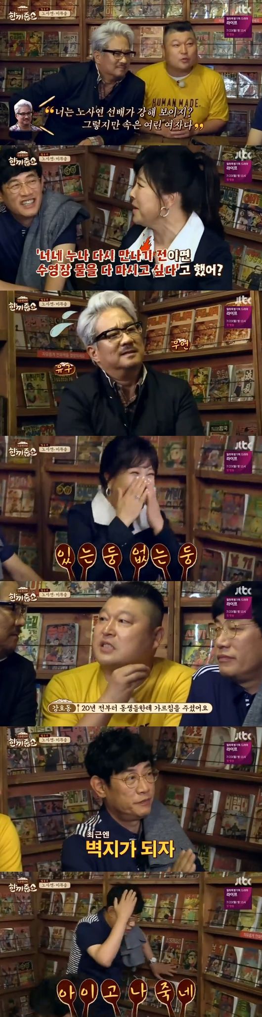 노사연은 "나도 여자인데 처음에 반응 없더라, 맨정신으로 스킨십이 힘드니 술을 먹고 발베개를 누웠다. 그런데 쿠션으로 바꾸면서 빠져나갔다"며 이무송이 철벽을 쳤다고 말해 웃음을 안겼다. 그 사건이후로 자존심이 무너졌다며 마음의 정리와 이별통보를 했다고 했다.