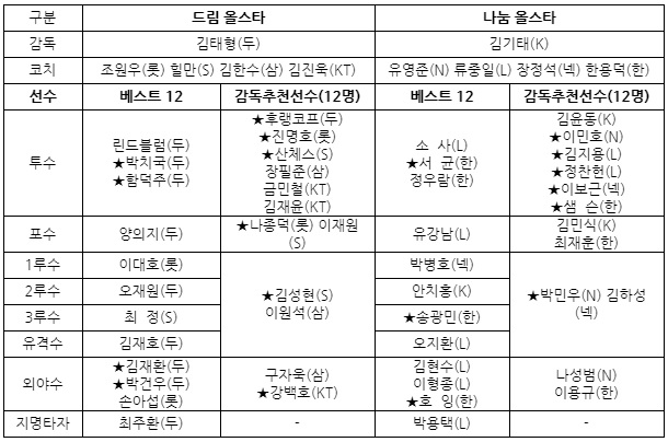 두산 김태형 감독이 이끄는 드림 올스타는 후랭코프(두산), 진명호, 나종덕(이상 롯데), 산체스, 이재원, 김성현(이상 SK), 장필준, 이원석, 구자욱(이상 삼성), 금민철, 김재윤, 강백호(이상 KT)가 선정됐다.