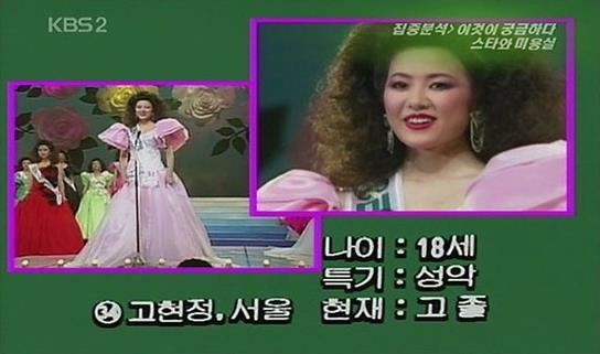 1989년에는 배우 오현경이 33대 미스코리아 진에 당선됐는데 선인 고현정 역시 빼놓을 수 없는 '미코 출신'이다. 1990년대 후반, 그는 한국의 미를 대표하는 배우로 승승장구했고 현재까지도 많은 여성 팬들에게 영향력을 끼치고 있다. 대회 당시 고현정의 미모는 지금 봐도 훌륭하다.