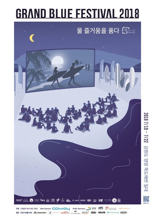 뜨거운 햇볕, 시원한 물, 짜릿한 영화를 동시에 만끽할 수 있는 한 여름 밤의 축제 ‘그랑블루 페스티벌 2018’이 열린다. 2017년 첫 회가 큰 호평을 모은데 이어 이번 ‘그랑블루 페스티벌2018’은 2018년 7월 19일(목)부터 7월 22일(일)까지 4일동안, 서퍼들의 천국 양양 죽도해변에서 개최된다.