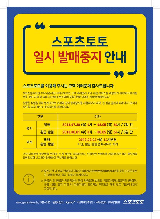 한편,이번 발매중단에 대한 정확한 사항은 스포츠토토(www.sportstoto.co.kr) 및 베트맨(www.betman.co.kr) 홈페이지를 통해 확인할 수 있다.