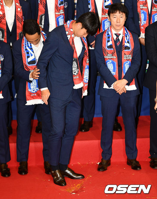 지난 6월 29일 신태용 감독과 기성용을 제외한 선수 22인이 해단식을 가졌다. 많은 팬들이 대표팀에게 응원을 보냈지만, 일부 몰지각한 팬이 쿠션과 계란을 투척하여 큰 논란을 일으켰다. 특히 계란은 인터뷰를 진행하던 손흥민을 강타할 뻔 했다.