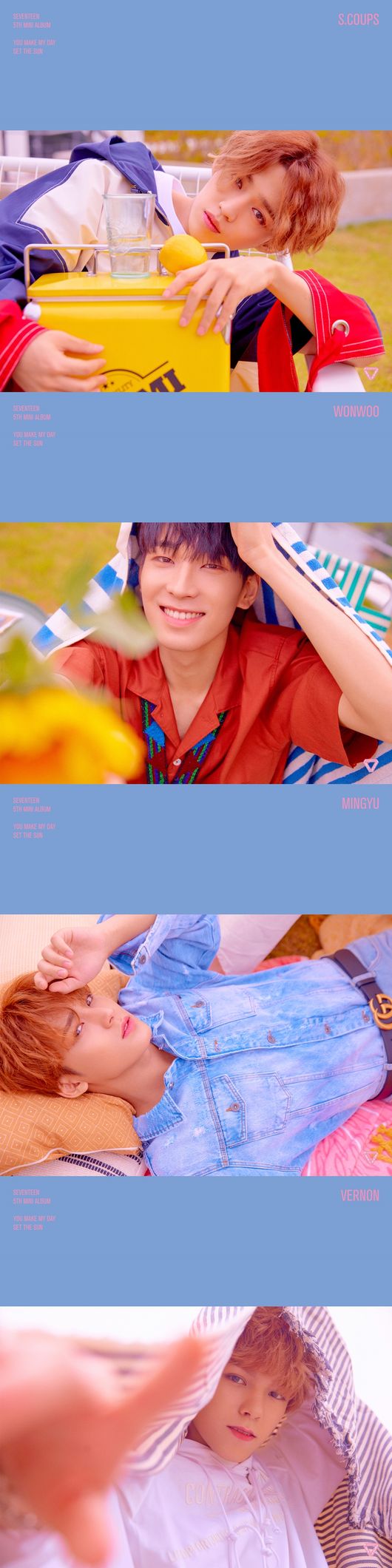 소속사 플레디스 엔터테인먼트는 오늘(6일) 자정 세븐틴 공식 SNS 채널을 통해 미니 5집 ‘YOU MAKE MY DAY(유 메이크 마이 데이)’의 ‘SET THE SUN ver. #1’ 오피셜 포토 멤버 에스쿱스, 원우, 민규, 버논을 공개하며 다가오는 컴백의 기대감을 한층 더 높였다.