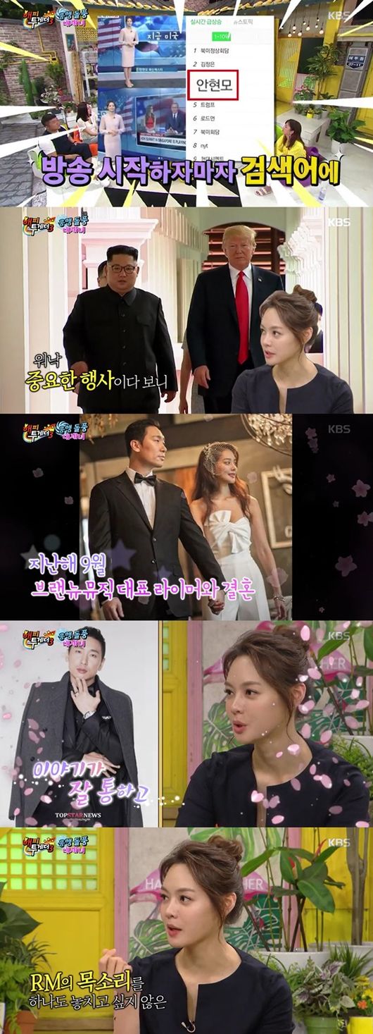 브랜뉴뮤직의 수장인 라이머와 지난해 9월 결혼한 안현모는 이날 자연스럽게 라이머와의 첫 만남을 공개하고, ‘엄친딸’답게 공부를 했던 비결을 밝히는 등 다양한 이야기를 전했다. 논리정연하고 귀에 쏙쏙 박히는 그의 토크는 MC들도 감탄하게 하기 충분했다. 예능 초보인 안현모는 ‘해투’ 등장과 동시에 실시간 검색어를 장악하는 위력을 보이기도.