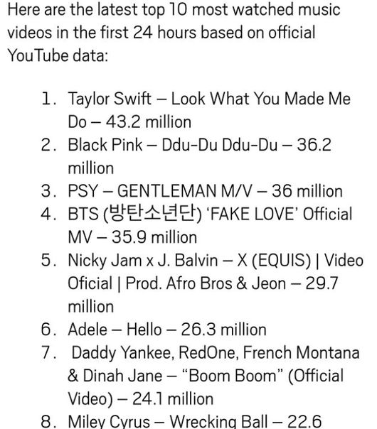 이와 함께 해당 차트를 공개했다. 유튜브에서 뮤직비디오 24시간 조회수 톱10 순위 차트에서 '뚜두뚜두'는 36.2million(3620만)으로 테일러 스위프트에 이어 2위를 기록 중이다. K팝으로는 1위의 성적이다.