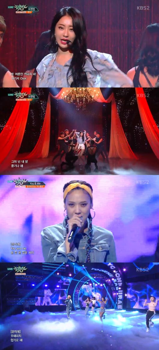 윤미래는 '랩퀸의 귀환'으로 '뮤직뱅크' 무대를 압도했다. 윤미래의 신곡 '유앤미(You&Me)'는 남녀간 우정 이상의 아슬아슬한 감정 변화를 그린 네오소울 장르의 곡. 윤미래는 오랜만의 컴백에도 완벽한 무대 장악력으로 '힙합 레전드'의 빛나는 컴백으로 시선을 사로잡았다. '쇼미더머니6'로 스타덤에 오른 래퍼 주노플로가 피처링으로 출격, 더욱 완벽한 무대를 완성했다.