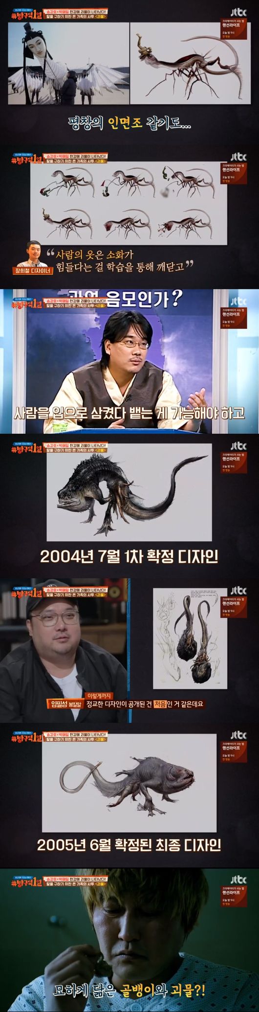 괴물의 디자인에 대해서는 장희철 디자이너가 변천 과정을 사진으로 보내줬다. 이에 따르면, 2003년에는 물방개를 모델로 했다. 옷을 입은 상태에서 먹기 힘들어서 옷을 벗겨서 먹는 특성이 있다. 사람을 먹었다가 뱉을 수도 있고 긴 꼬리를 이용해 사람을 감고 한강 다리를 걸어다니는 게 가능해야 한다는 봉준호 감독의 피드백에 어류와 양서류가 조합된 형태로 바뀌었다. 2005년 6월 확정된 최종 디자인. 3년 간 2000장이 넘는 스케치를 거쳐 탄생했다고 한다.
