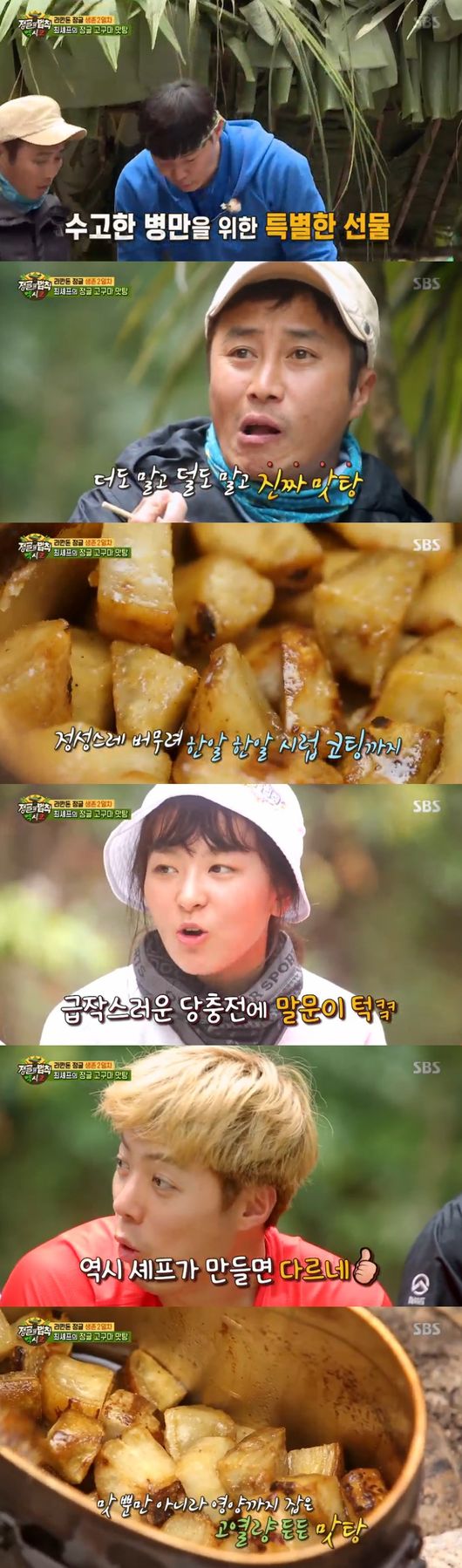 이때, 보라랑 강남, 승훈이 낚시를 마치고 돌아왔다. 절묘한 타이망에 족장 김병만도 돌아왔다. 역시나 빈손없이 돌아온 김병만이었다. 수고한 병만을 위해 최현석은 완성된 맛탕을 먼저 맛보게 했다. 김병만은 "진짜 맛탕이다"고 감탄, 나머지 멤버들은 "역시 셰프다, 맛이 다르다"면서 사냥한 보람을 주는 완벽한 보상이라 했다.