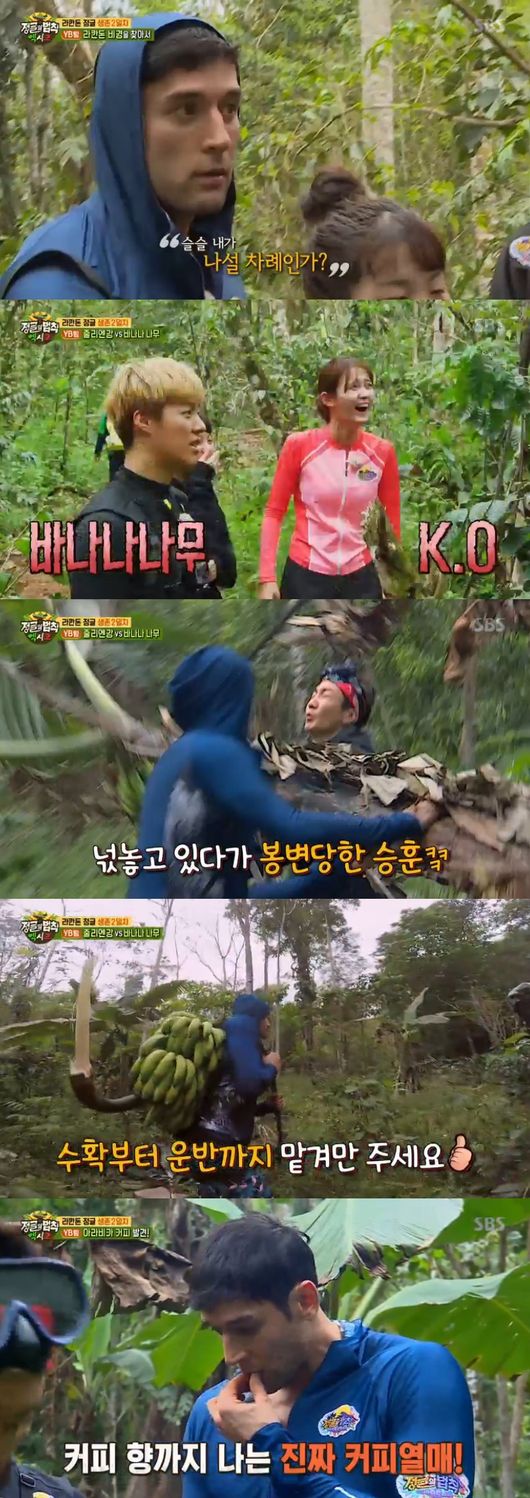 젊음의 혈기가 넘치는 YB팀은 먹을 것을 사냥하러 가기로 했다. 시원한 폭포를 만날 생각에 모두 들뜬 모습을 보였다. 배고픔을 호소하던 중 바나나 나무를 발견했다. 하지만 따는 것이 문제였다. 줄리엔강은 "발차기로 딸 수 있다"라면서 슈퍼니킥을 날리며 큰 나무를 쓰러뜨리는데 성공했다.마치 서커스같은 광경에 멤버들 모두 경악하며 입을 다물지 못했다. 줄기까지 한 방에 뜯어내자 "인간 병기다"라며 놀라워했고, 줄리엔강은 이 기세를 몰아 수확부터 운반까지 모두 도맡았다.