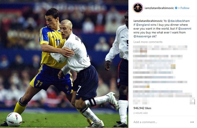 스웨덴 대표팀 출신 이브라히모비치는 이날 자신의 인스타그램에 선수시절 맞대결 모습의 사진까지 올리며 잉글랜드 대표팀 출신인 베컴을 향해 달콤한 제안에 나섰다.