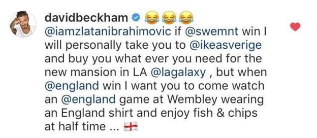 베컴은 트위터를 통해 "만약 스웨덴이 이기면 개인적으로 당신을 이케아로 모셔 가서 LA에 있는 당신의 멘션을 가득 채울 수 있도록 뭐든 사주겠다. 하지만 잉글랜드가 이기면 잉글랜드 셔츠를 입고 웸블리에서 전반까지 잉글랜드 경기를 같이 보며 피쉬 앤 칩스를 먹자"고 맞받았다.