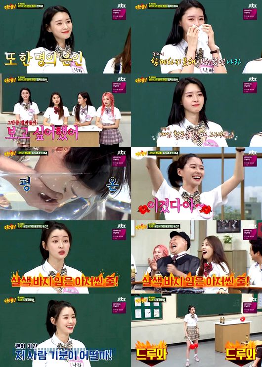 나라는 지난 7일 오후 방송한 JTBC '아는 형님'에 보라, 모모랜드 연우, 주이와 함께 '신(新) 라라랜드'의 멤버로 출연했다. 그간 드라마 촬영으로 바쁜 나날을 보냈던 나라는 오랜만의 예능 나들이를 맞이해 다양한 매력을 쏟아내며 시청자들을 즐겁게 했다.