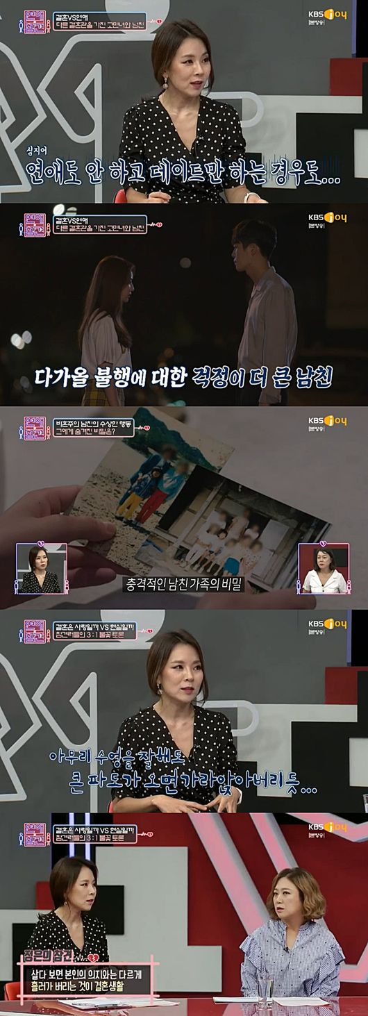 지난 7일 방송된 KBS Joy 로맨스파괴 토크쇼 ‘연애의 참견’ 25회에서는 결혼을 약속한 남친의 남다른 가정사를 접하고 결혼을 망설이고 있는 사연녀의 고민이 공개됐다.