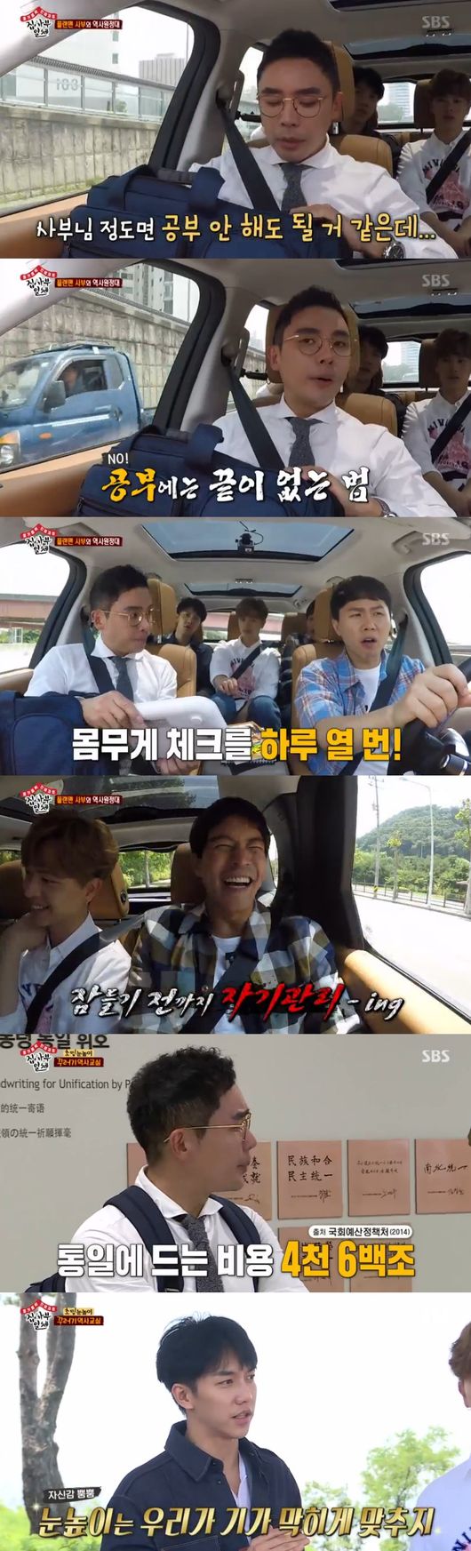 가는 길 내내 설민석은 또 공부를 시작했다. 설민석은 "공부에는 끝이 없다. 바뀌는 출제범위를 분석하기 위해서 계속 해야한다"고 했다. 설민석 가방 속에선 체중계도 나왔다. 그는 몸무게 체크를 하루에 열번이나 한다고 했다. 상윤은 "관리하는 삶 행복하시냐"고 질문, 설민석은 "너무 행복하다, 잠은 죽어서 자는 것"이라 말해 모두의 배꼽을 잡았다.