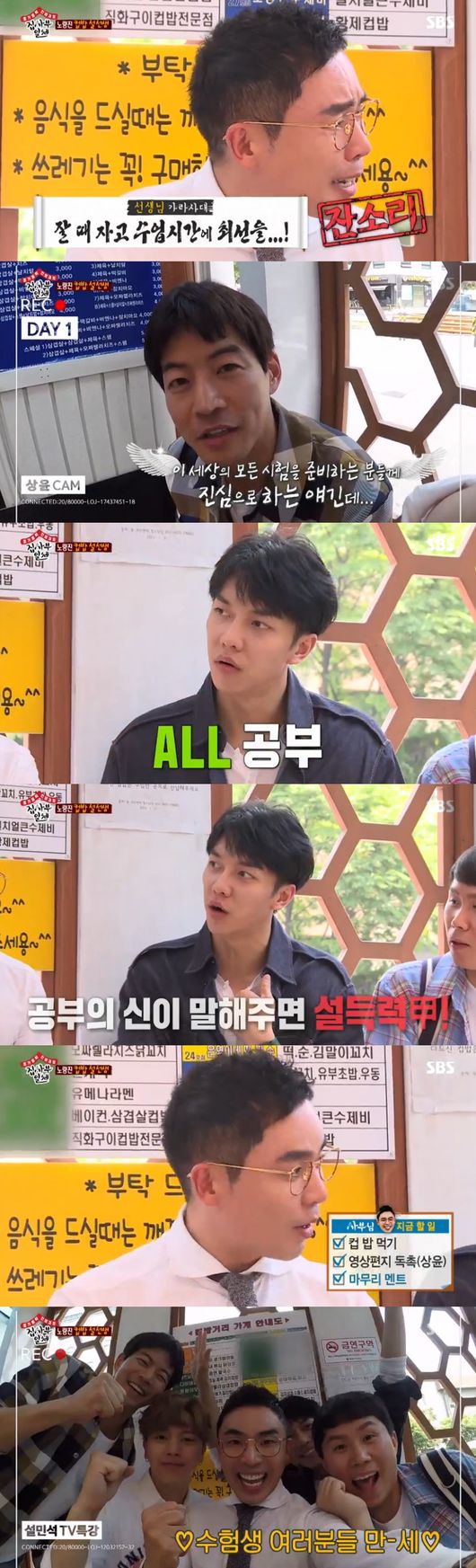 또한 컵밥을 먹던 시절을 회상하자, 양세형은 "개그에 미쳐있었기에 봉지라면을 많이 먹었다. 그때는 정말 아무렇지 않게 생각했다"고 했다. 공부의 신 상윤의 학창시절을 어땠을지 모두 궁금해했다. 서울대 출신인 그는 "고 3내내 수업시간에 졸았던 적이 없다"고 말해 모두를 놀라게 했다. 설민석은 "성적안나오는 학생 특징, 의욕과다로 밤생 공부하지만 수업시간에 잔다"고 말했다.상윤은 "10시 드라마 보고 11시에 씻고 잤다, 일찍 자는 대신 오전 7시 등교후 점심시간 제외하고는 계속 공부만 했다"면서 깨어있는 시간을 최대한 활용해야 한다고 했다. 설민석은 "개인적인 부탁이다, 잘때자고 수업시간에 최선을 잘하라는 말을 대신 해달라"고 부탁했고, 상윤은 "가장 중요한 건 효율성, 잘때 자고 할 때 해라, 어설프게 오래하는 건 옳지 않다. 쉴 때는 확실히 쉬어달라"며 공부하고 있는 후배들에게 영상편지를 보냈다. 이어 모두 함께 "수험생들 파이팅"을 외치며 분량을 챙기는 모습이 웃음을 안겼다.