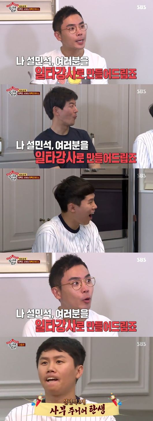 이날 설민석은 "23년간 역사를 공부한 사람이 역사에 관심없는 청년들에게 역사를 가르치고 있는 이것 역시 역사적인 사건"이라며 멤버들을 반겼다. 하지만 이상윤은 설민석을 알아보지 못했고, 이에 설민석은 “최근 5년 간 처음이다. 역사를 알면 설민석이 보인다”라고 말해 웃음을 안겼다. 또한 설민석이 봉긋머리와 안경이 트레이드마크가 됐다고 말하자 이승기는 “역사계의 뽀로로인 것 같다”라고 받아쳐 웃음바다로 만들었다.
