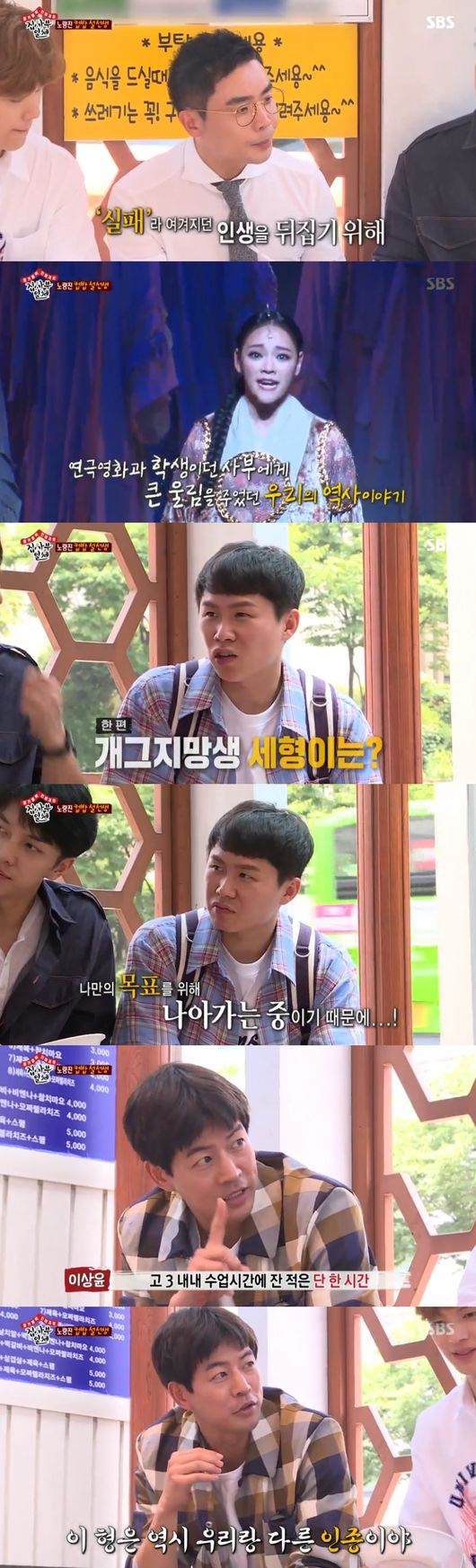 대학을 못가면 인생 실패자란 인식으로 힘들어했다고 했다. 이 때문에 노량진에서 컵밥을 먹으며 청년시절을 보냈다고했다. 이어 사회생활을 하기 위해 돈을 모으기 시작했다고. 서빙, 보모 ,세차장, 산타클로스 분장, 막노동까지 가릴 것 없이 아르바이트 했던 과거를 언급했다. 실패를 성공으로 뒤집기위해 자금을 모았다는 것이다. 그러던 중 우연히 '명성왕후' 뮤지컬을 봤다고 했다. 그때 연극영화과 학생이던 설민석의 꿈이 연극를 하듯 역사를 전달하는 것으로 바뀌었고, 이후 설민석표 강의가 시작된 계기라 전했다. 이어 모두 함께 "수험생들 파이팅"을 외치며 분량을 챙기는 모습이 웃음을 안겼다.